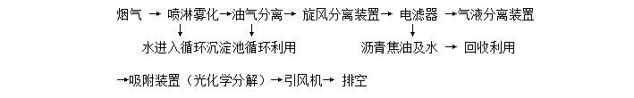 在引風(fēng)機的負(fù)壓作用下帶有粉塵物質(zhì)的瀝青煙氣經(jīng)過加裝噴淋頭的管道,經(jīng)過連續(xù)噴漆淋使煙氣中的油粒子和小粉塵等被沖洗下來、混溶于水中后流入冷卻循環(huán)水池,出來的煙氣經(jīng)油氣分離裝置去除部分油質(zhì)及水分后進(jìn)入旋風(fēng)除塵除去部分不溶于水的焦粉等粉顆粒類物質(zhì),而后進(jìn)入瀝青煙電濾器捕集掉剩余的油污及膠粉顆粒,處理后的氣體再經(jīng)過氣液分離裝置再次精細(xì)凈化,然后再進(jìn)入吸附裝置或光化學(xué)分解裝置,除掉煙氣中的瀝青異味,凈化后煙氣通過煙囪排入大氣。